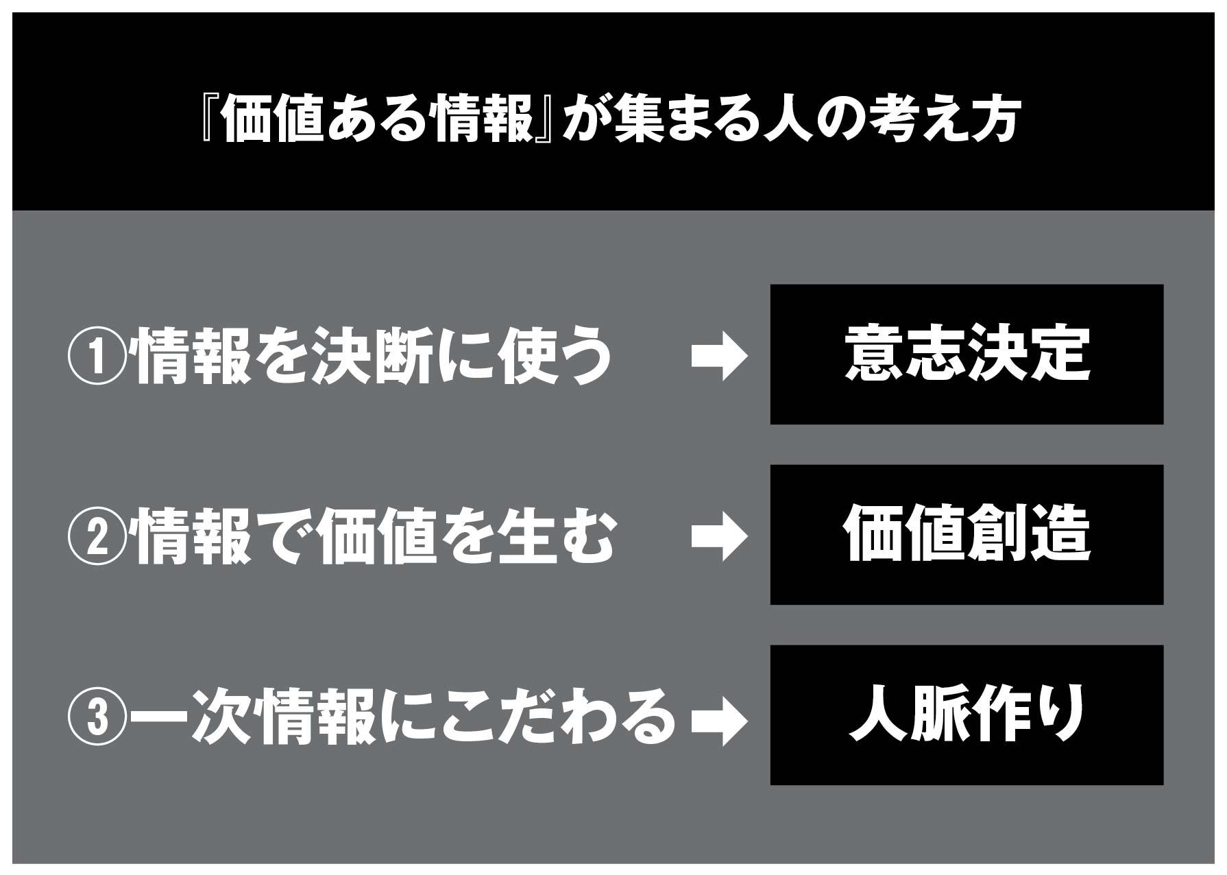 まず、『①情報を決断に使う』について。これは、『情報』というのは意思決定や経営判断に使うものであるという考えを意味しています。収集することや調べることが目的ではなく、何かの決断に使うというのが情報収集の目的である、ということをブラさないことが重要となります。次に、『②情報で価値を生む』について。これは、新たな価値、あるいは利益を生むことこそが情報を利用することの意義であるということ意味しています。情報というのは無料ではなく有料であり、収集するだけではなく利用して価値を生むことが重要だと捉えるべきであります。そして、『③一次情報にこだわる』について。『価値ある情報』が集まる人はここを一番大切にしています。川上情報や実体験、つまり一次情報を入手するために惜しまず時間やお金を費やします。人との繋がりを大切にし、インターネットや人伝えの情報ではなく自らつかむ情報にこだわります。一次情報にこそ本当の価値があると考えているのでしょう。