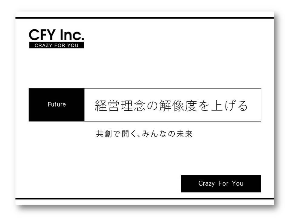 このような形で経営理念、特にビジョンの解像度を上げました。解像度を上げたビジョンを仲間と共有し理念経営を遂行していきたいと思います。しかし、理念経営において一番重要な鍵を握っているのは、実は「バリュー(身体をつくる日々の食事)」です。人間の食事と一緒で日々のバリューがビジョン(理想的な身体)をつくり理念経営を遂行していきますので、とても大切な役割を果たします。このバリューに関しては、CFYでは解像度を上げるまでもなく既にプロジェクトチームが実践してくれています。これは本当に心強いことです。バリュープロジェクトチームのみんな、本当にありがとうございます。そしてこれからも宜しくお願いします。
