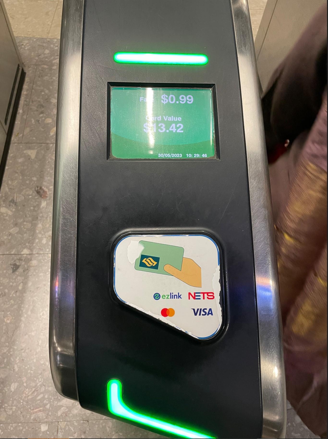 はい、注目!良く見ると「VISA」と「Mastercard」のマークが見えますね。そう!クレジットカードです。シンガポールの電車はクレジットカードでそのまま乗車することもできちゃうんです。これは便利ですねー。EZ-Linkカードなどを作るのがNGな人は、コンタクトレス(非接触)決済機能付きクレジットカードでどうぞ。ただし、シンガポール国内発行のクレカじゃないと少し手数料が掛かるので注意が必要です。