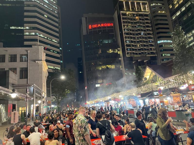 そしてこちらはホーカー。ホーカーとは、屋台(ストール)がたくさん集まったフードコートのようなもので、シンガポール人の日常を支える大切な存在です。政府が所有・管理・運営しており、清潔で衛生的な環境によってさまざまな人が食事を楽しめるようにと政府の手でしっかりと整備されています。こちらのラウパサは、シンガポールの金融街の中心部にある最も人気のあるホーカーのひとつ。年中無休で24H営業というから驚きです。便利ですねー