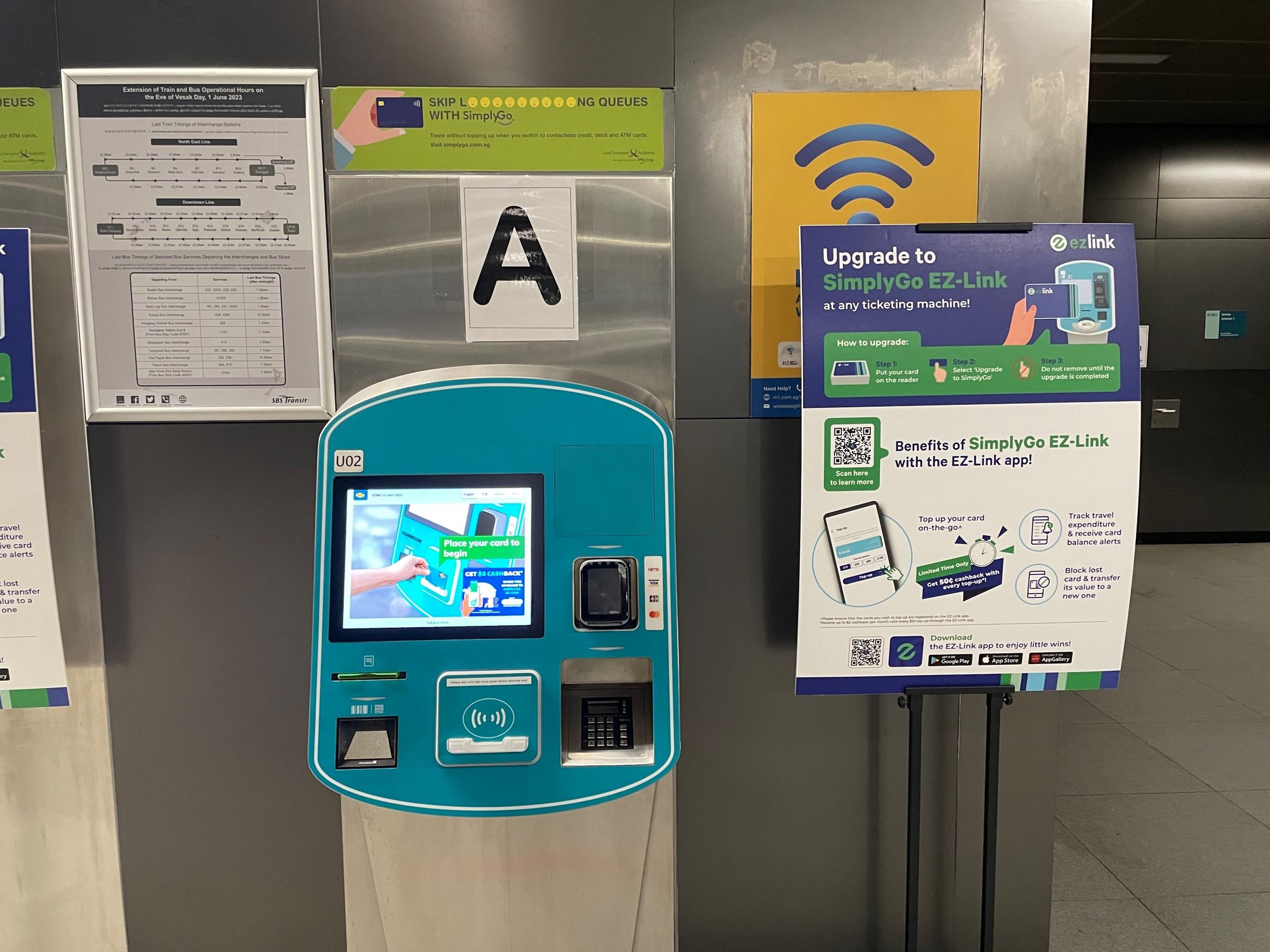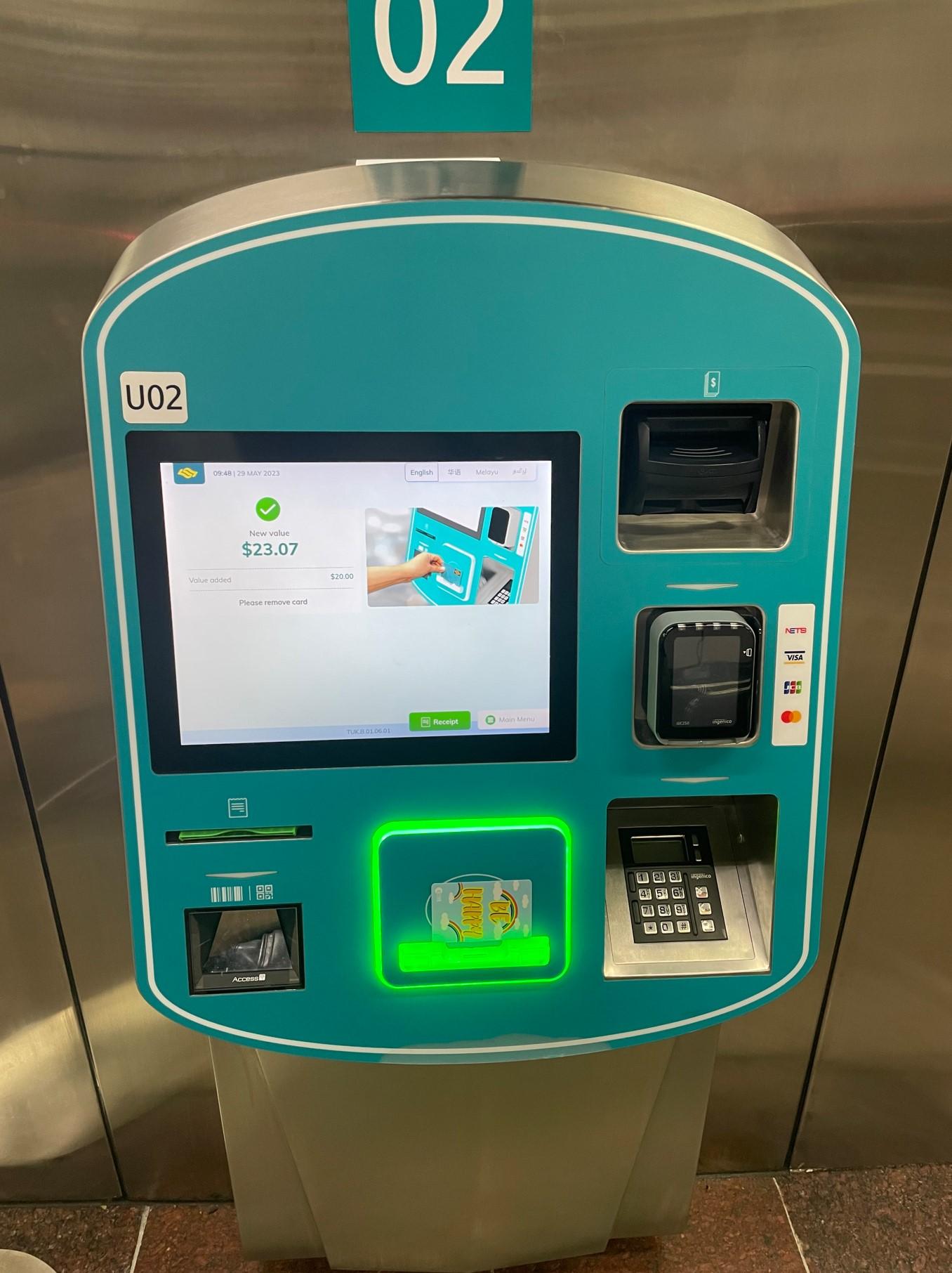 券売機でチャージする場合はこちらの機械で。クレジットカードしか使えない機械と、現金が使えるカードがあるので用途に合わせて選びます。チャージはS$10づつで良いでしょう。(私はS$20チャージして使い切れませんでした)