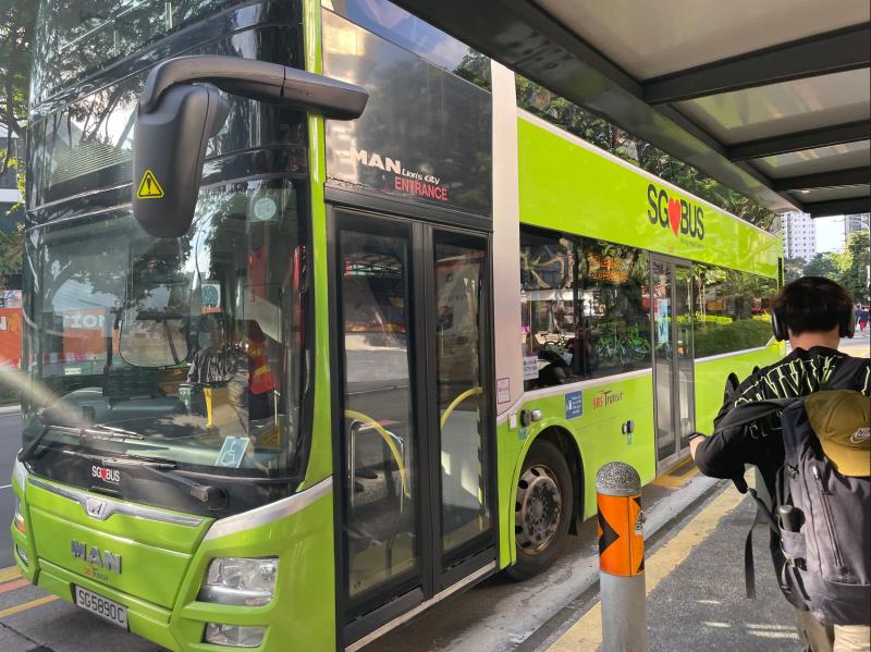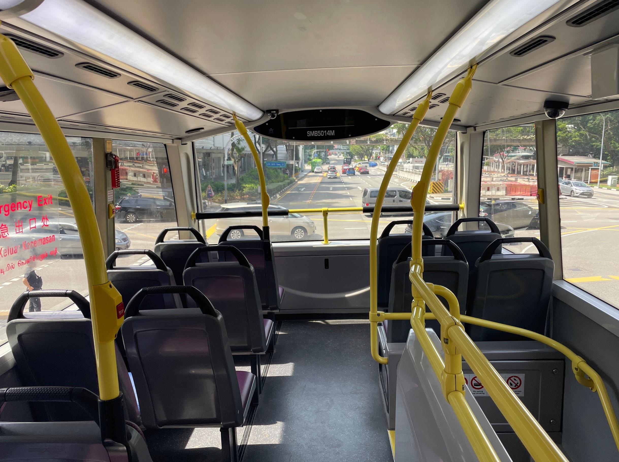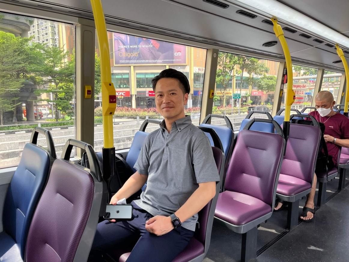 お次はバスに乗って交通分野のスマートネイションを実体験してみることに。シンガポールのバスはほとんどが2階建てバスになっています。チャンギ空港ターミナル3の建築と同じく、視覚的にスマートさを感じてしまいます。