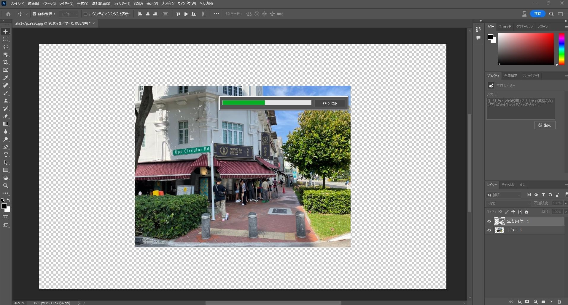 この写真もジェネレーティブ塗りつぶしによって背景を拡張してみたいと思います。ウネウネウネと待っていると