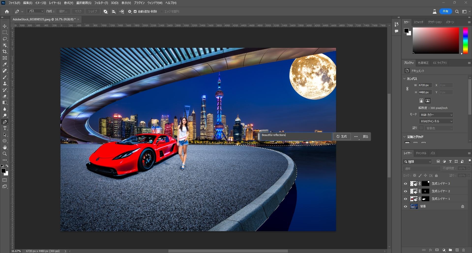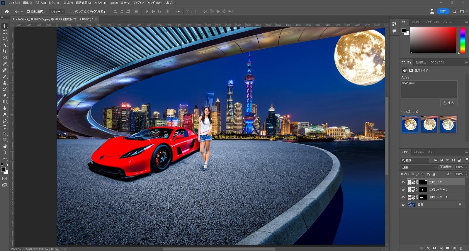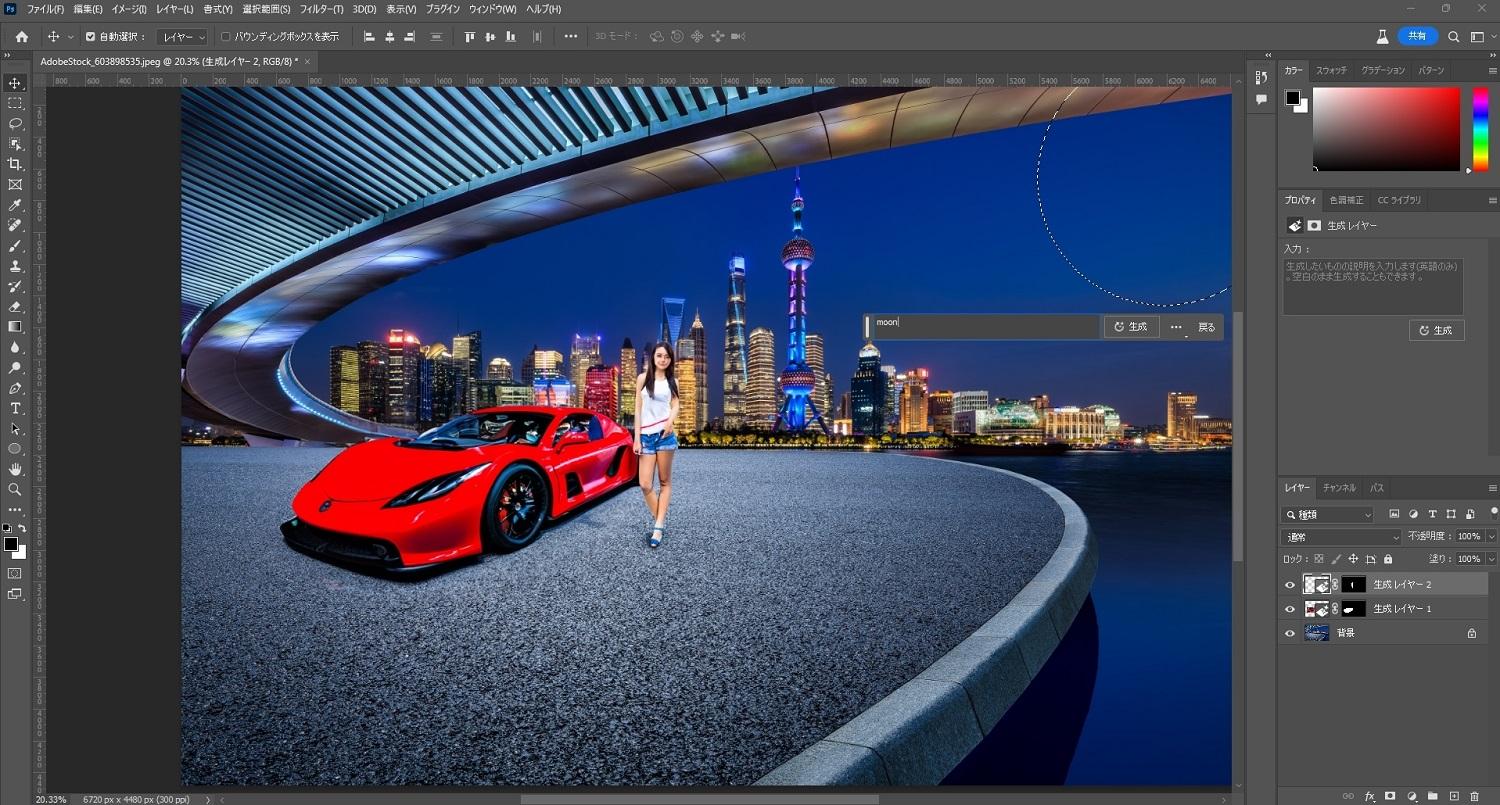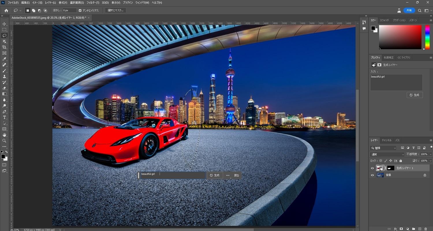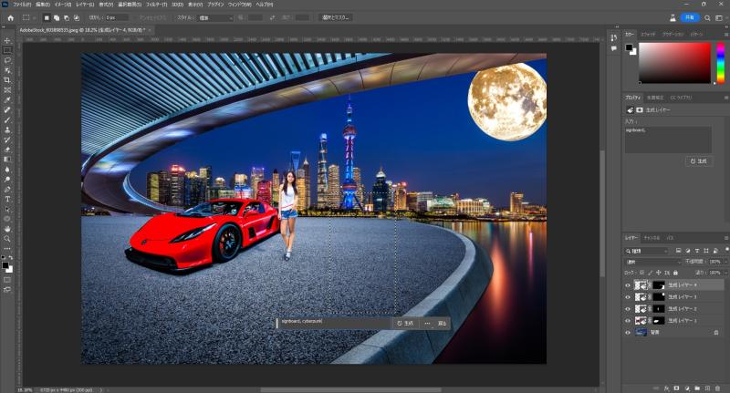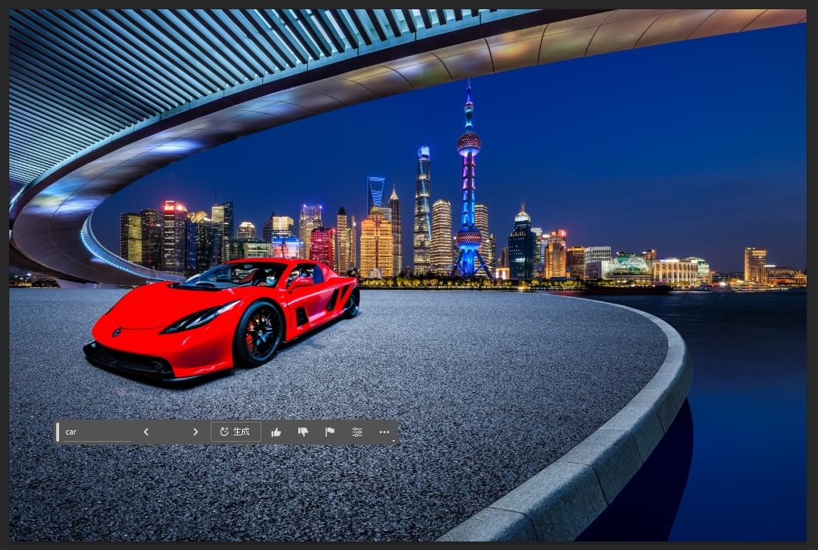 この綺麗な夜景に合う「車」を生成してみましょう。車を配置したい場所を選んで、プロンプト(AIにやってもらいたいことを指示する命令文)を入力すると