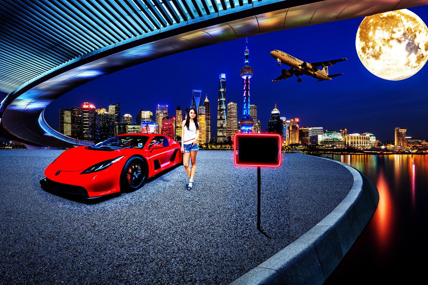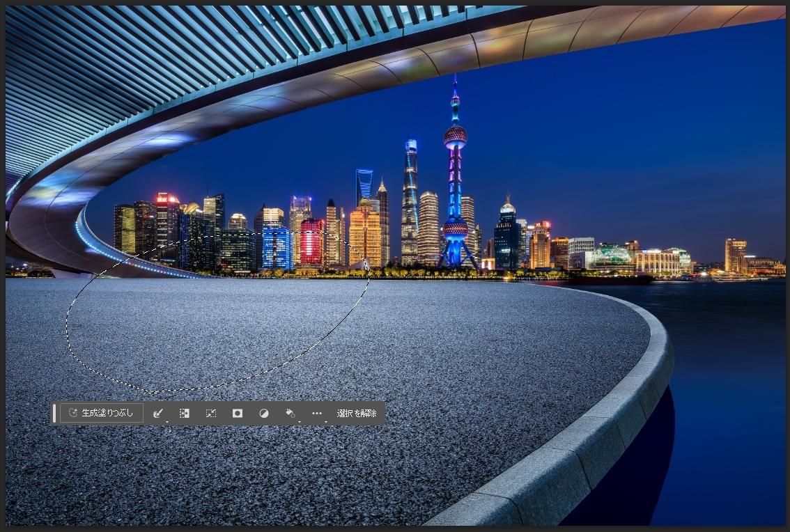 お次は、ジェネレーティブ塗りつぶしによって「オブジェクトを生成する」という操作を見てみたいと思います。こちらは中国上海の夜景画像です。綺麗ですね。(ちなみにこれもAIで生成した画像です)