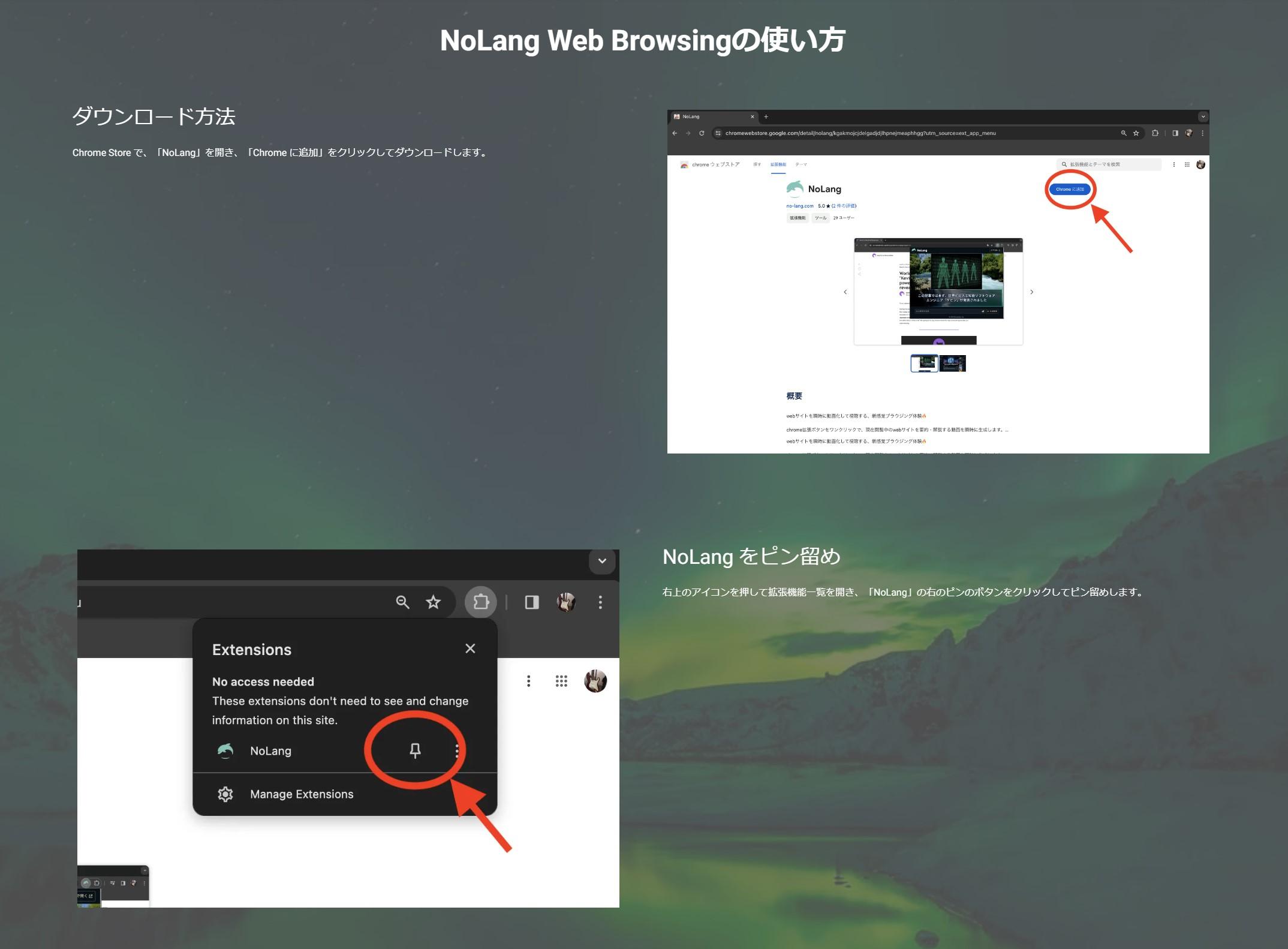 また、NoLangはChrome拡張機能も提供しており、NoLangのWebサイトを開かずにWebブラウザ上からワンクリックで呼び出すことができます。これはめちゃくちゃ便利なので使用頻度もおのずと高くなります。「Nolang Web Browsing」を使用するには最初だけ設定操作が必要ですが、3分もかからない程度の簡単な操作なので是非使ってみて頂きたいです。