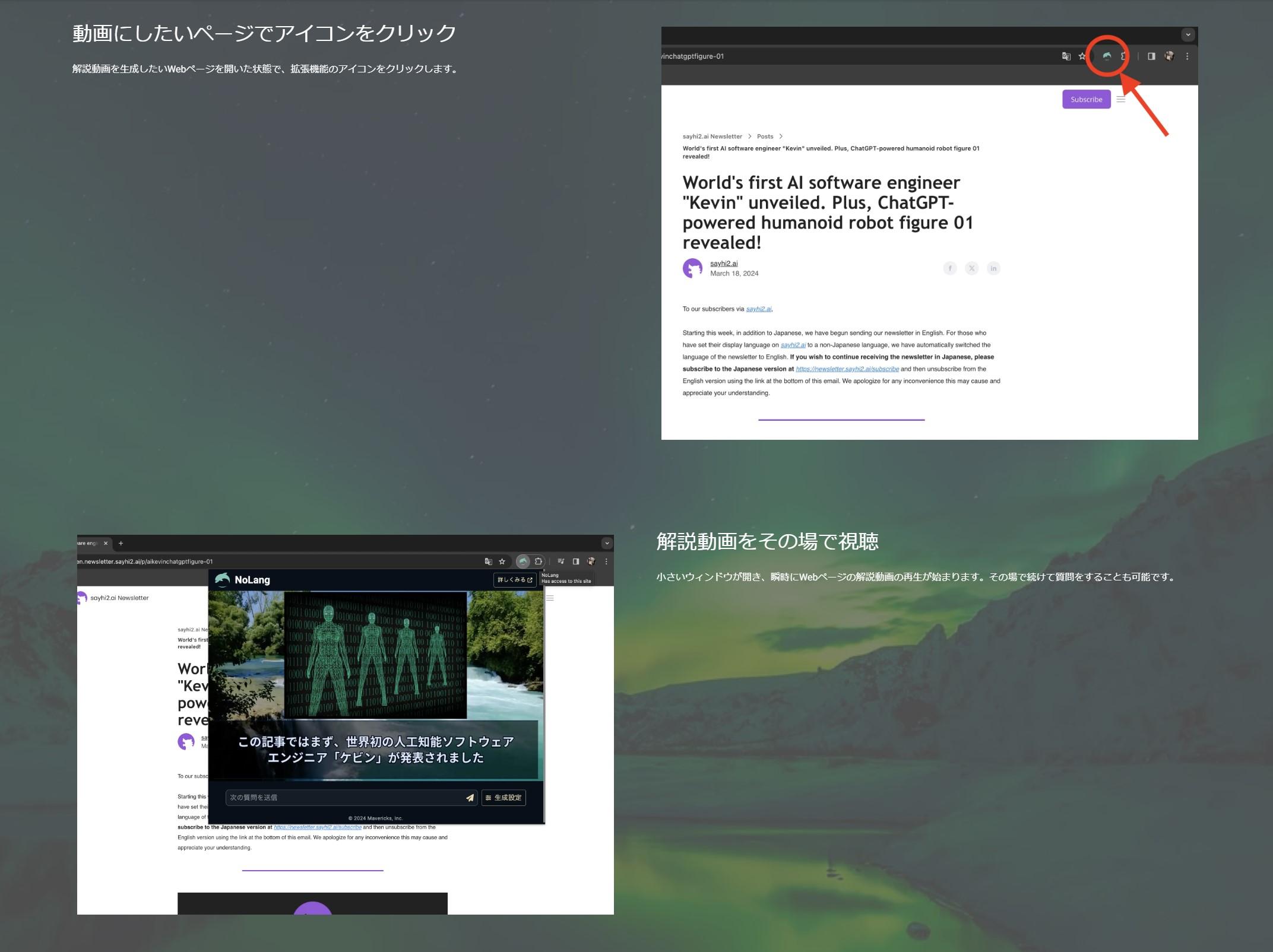 NoLangはどんな記事でも解説動画に変換できるということで、私のブログでも試してみました。「Nolang Web Browsing」の機能を使ってワンクリックしてみたら、しっかり3秒で動画に変換できました。感動。