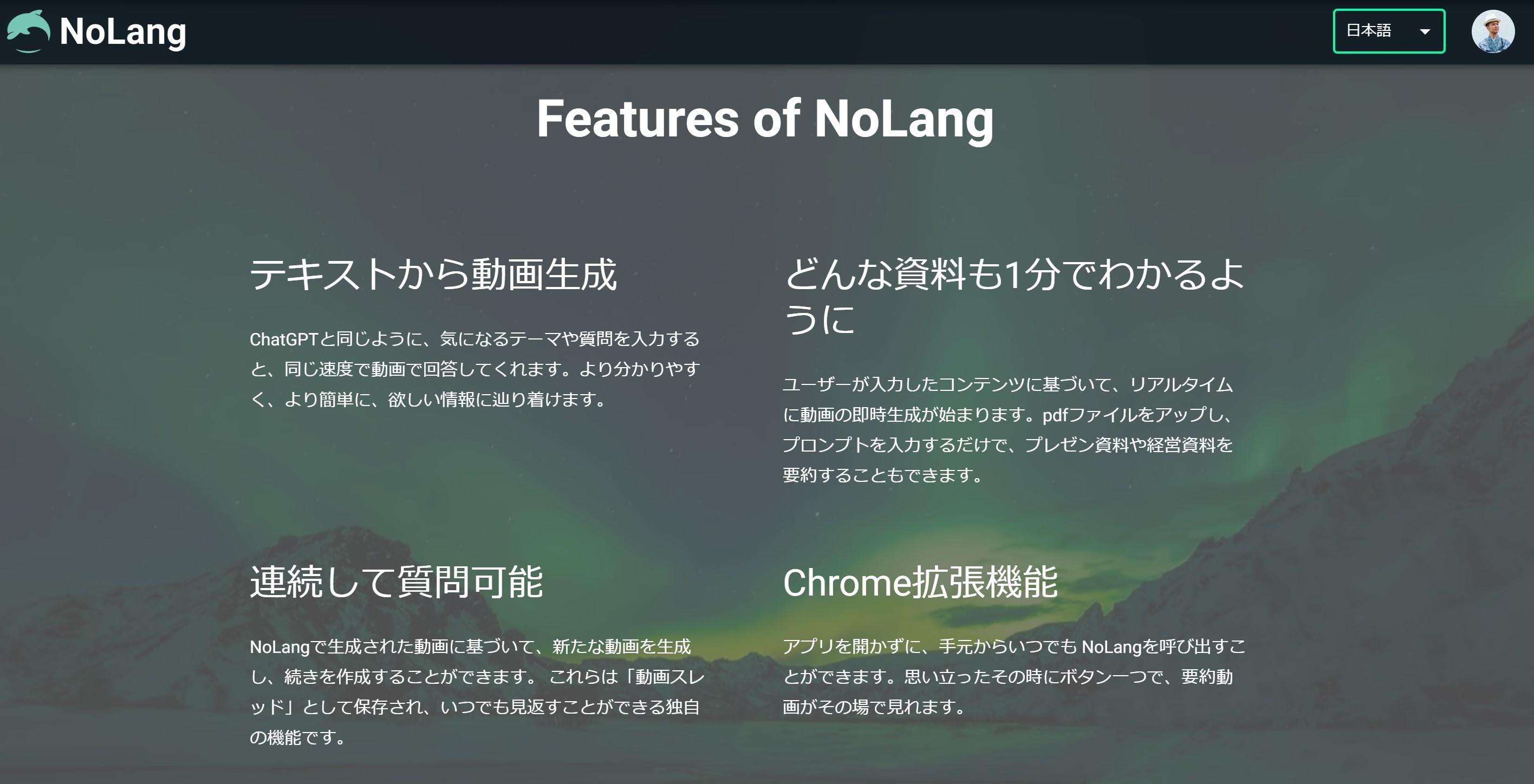 NoLangはネット上に公開されている記事を動画に変換できることはもちろん、PDFなどの文章ファイルもアップロードするだけで動画変換することができます。また、英語で書かれた海外のサイトや記事についても、翻訳しながら動画に変換して解説してくれます。さらに、生成された動画の内容に基づいて新たに続きの動画を生成することが可能です。例えば、自分が質問した内容に対しての回答が不十分だった場合に、追加で質問することで生成された動画の内容に基づいて新たに続きの動画を生成してくれる。NoLangはこんなことができちゃうんです。