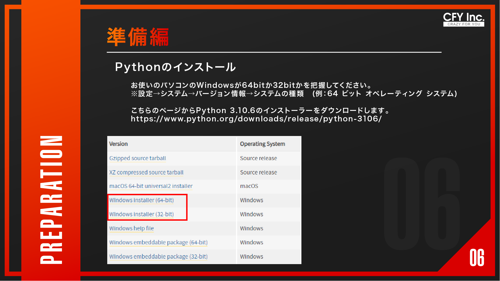 Pythonは、Pythonの公式サイトからインストールすることが出来ます。公式サイトを開くと複数のバージョンが存在してどれを選択していいか迷ってしまいますが、「Add Python 3.10 to PATH」にチェックを入れて「Install Now」をクリックすれば完了します。