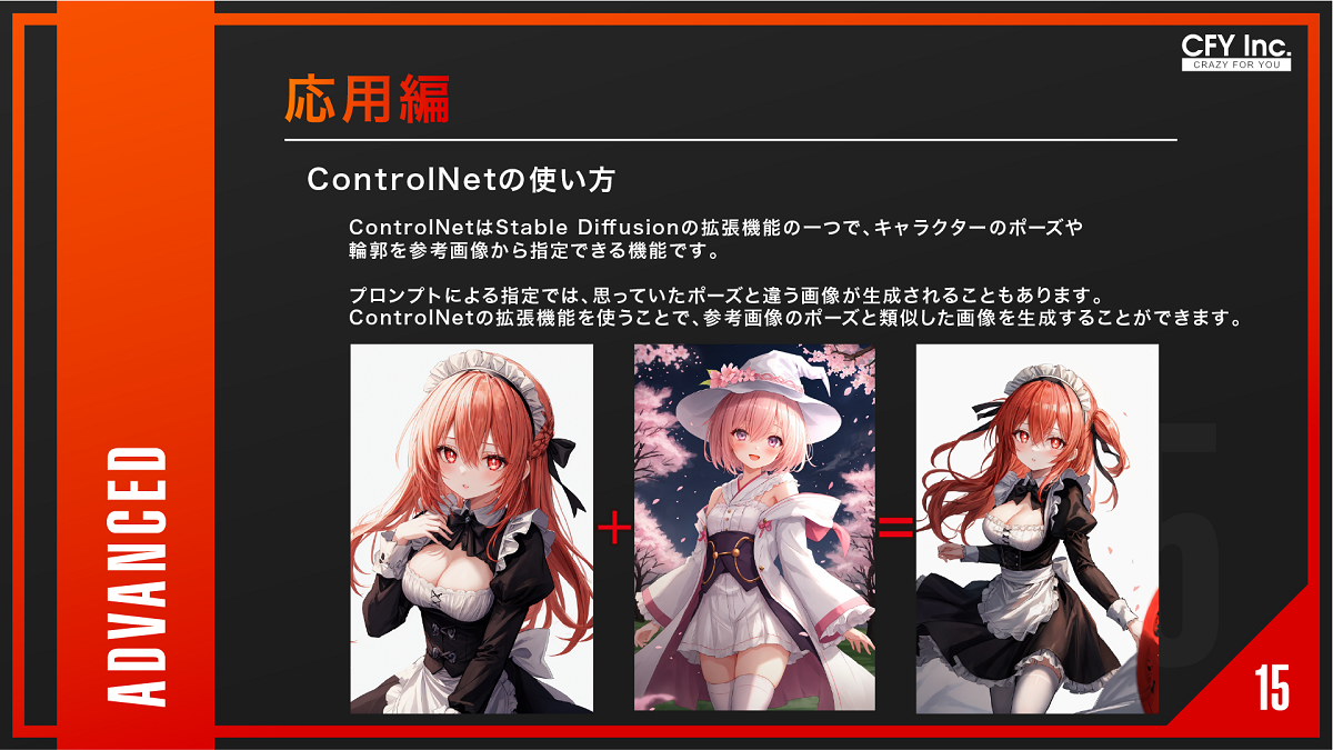 好みの画像が生成されたら、応用としてControlNetという機能を使ってポーズ変更を試してみましょう。プロンプトによる指定では、思っていたポーズと違う画像が生成されることもあります。ControlNetの拡張機能を使うことで、参考画像のポーズと類似した画像を生成することができます。
