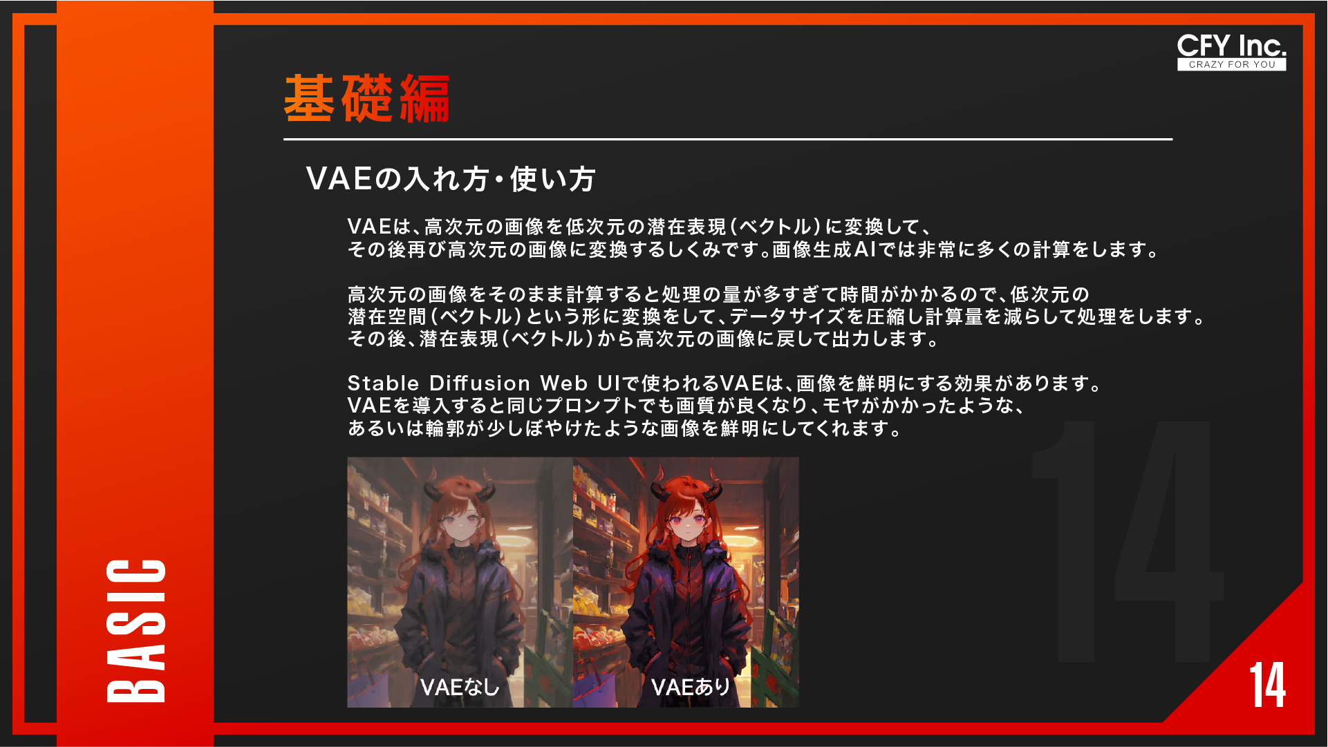 生成された画像は「VAE」という機能を使って画像を鮮明にする処理を行います。VAEを入れると同じプロンプトでも画像が良くなり、ぼやけた画像をクリアにすることができます。