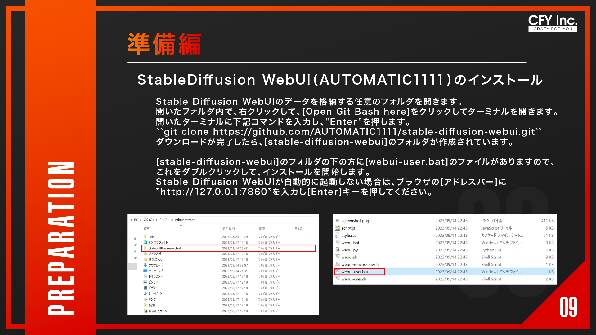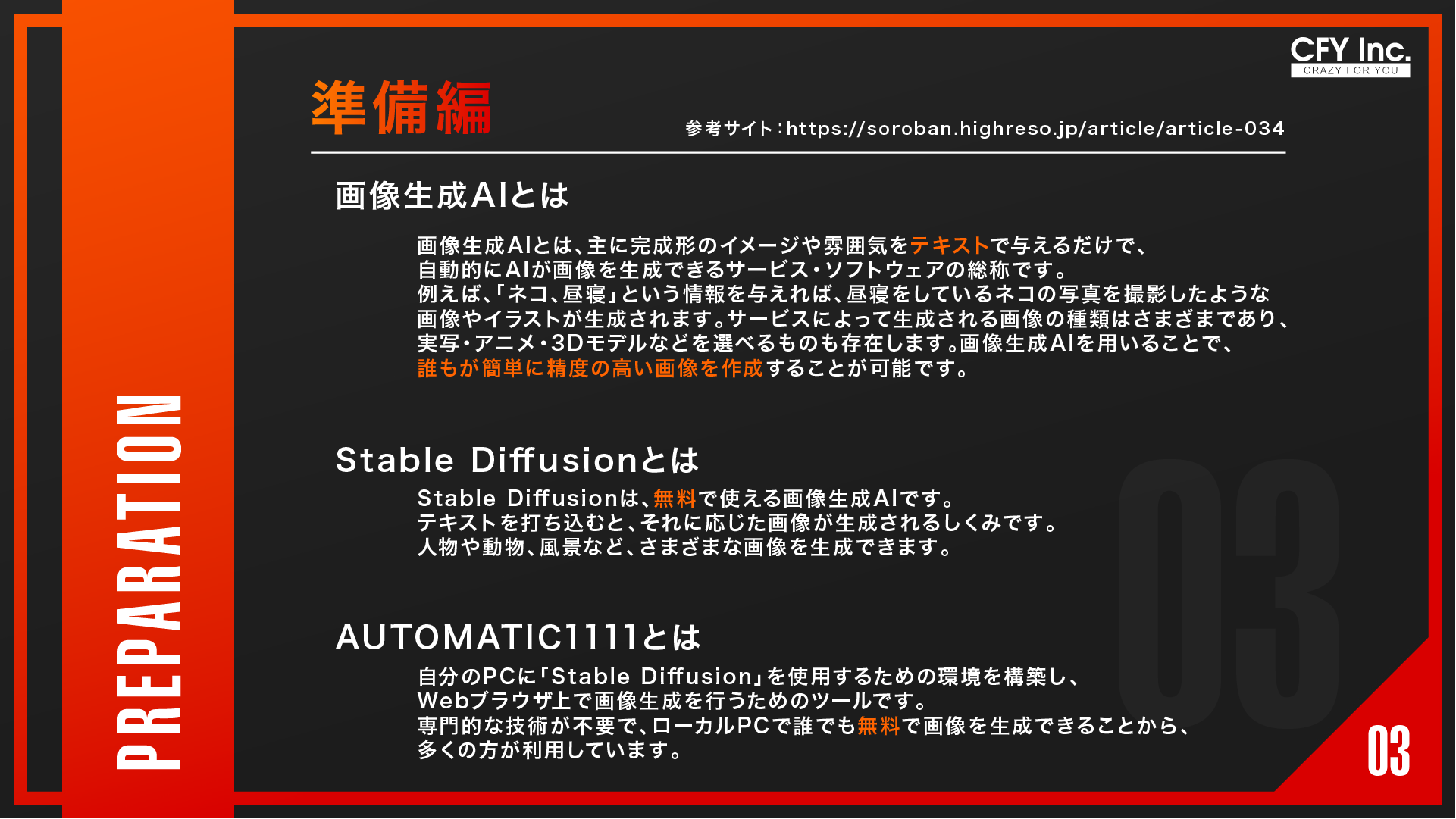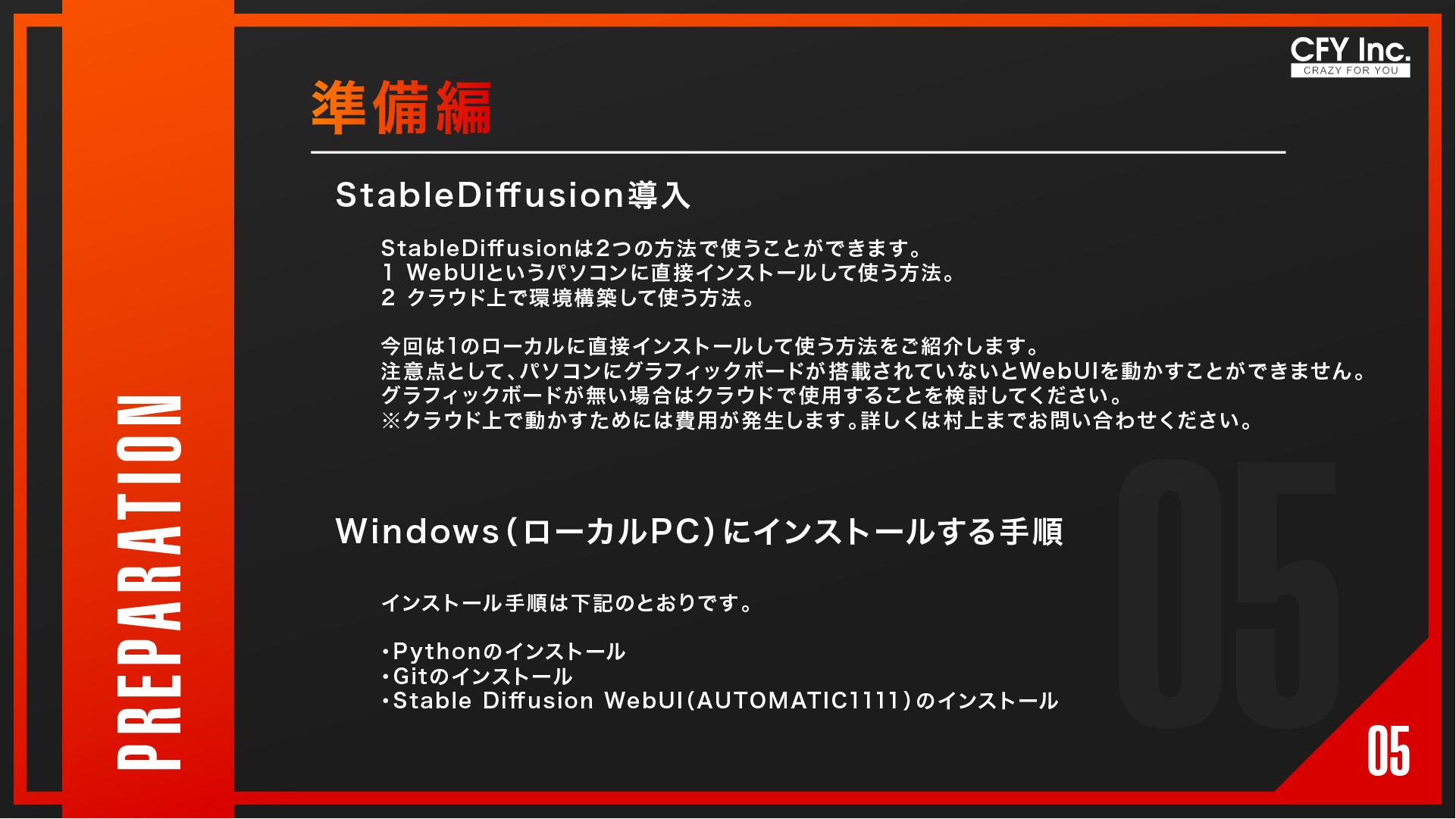 続いて「Stable Diffusion Web UI」というツールをインストールします。Stable Diffusion Web UIとは、自分のPCに「Stable Diffusion」を使用するための環境を構築し、Webブラウザ上で画像生成を行うためのツールです。 専門的な技術が不要で、ローカルPCで誰でも無料で画像を生成できることから、多くの方が利用しています。