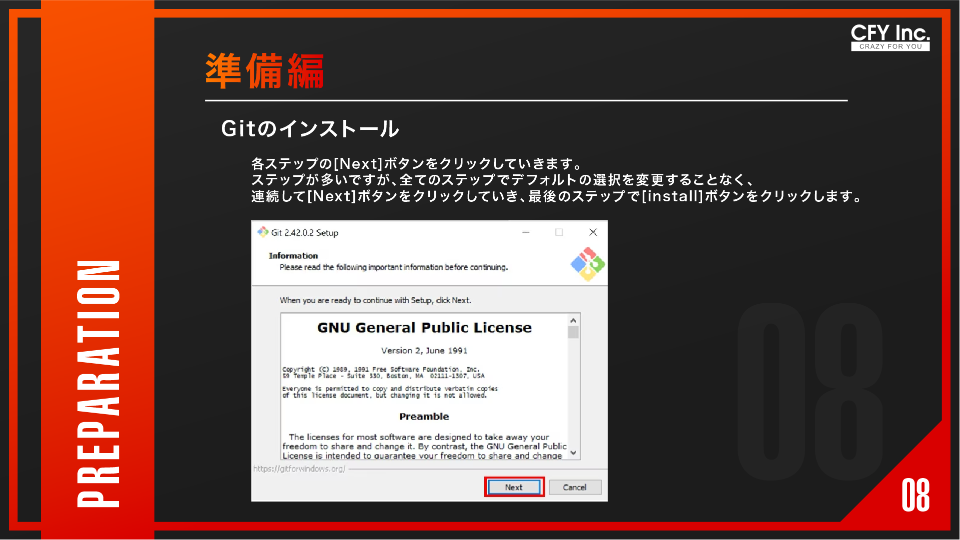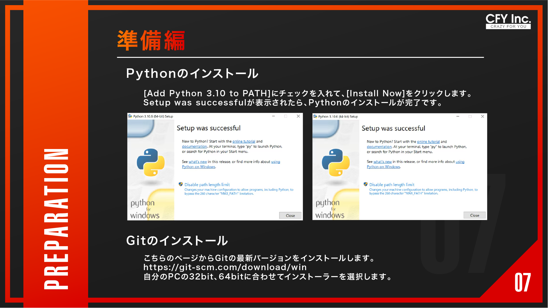 次に「Git」と呼ばれる管理システムをインストールします。Gitとは、コーディング中にAIが関連するコードを自動補完してくれるツールです。PythonでコーディングしたものをGitが修正・提案をしてくれるので、半自動で高速なコーディングが実現できます。
