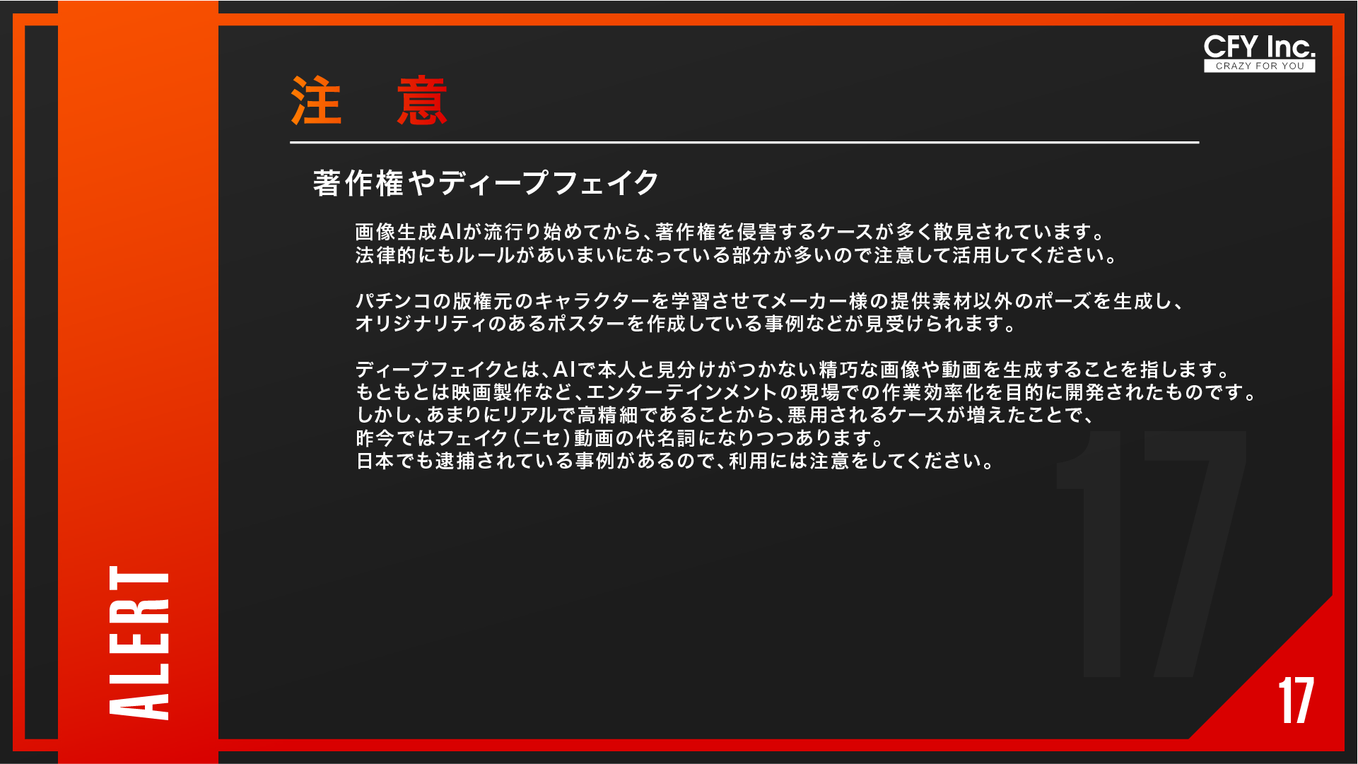 また、「ディープフェイク」についても日本で逮捕者が出るほど問題となっているので注意が必要です。ディープフェイクとは、AIで本人と見分けがつかない精巧な画像や動画を生成することを指します。元々は映画製作など、エンターテインメントの現場での作業効率化を目的に開発されたものになります。しかし、あまりにリアルで高精細であることから悪用されるケースが増えたことで、昨今ではフェイク(ニセ)画像や動画の代名詞になりつつあります。「遊び心」でディープフェイクを生成するようなことが無いようにして頂きたいと思います。