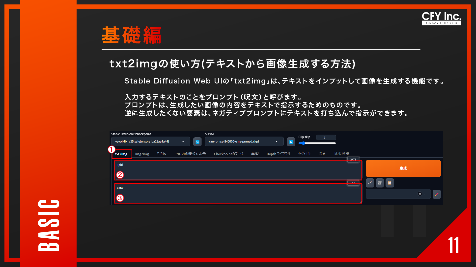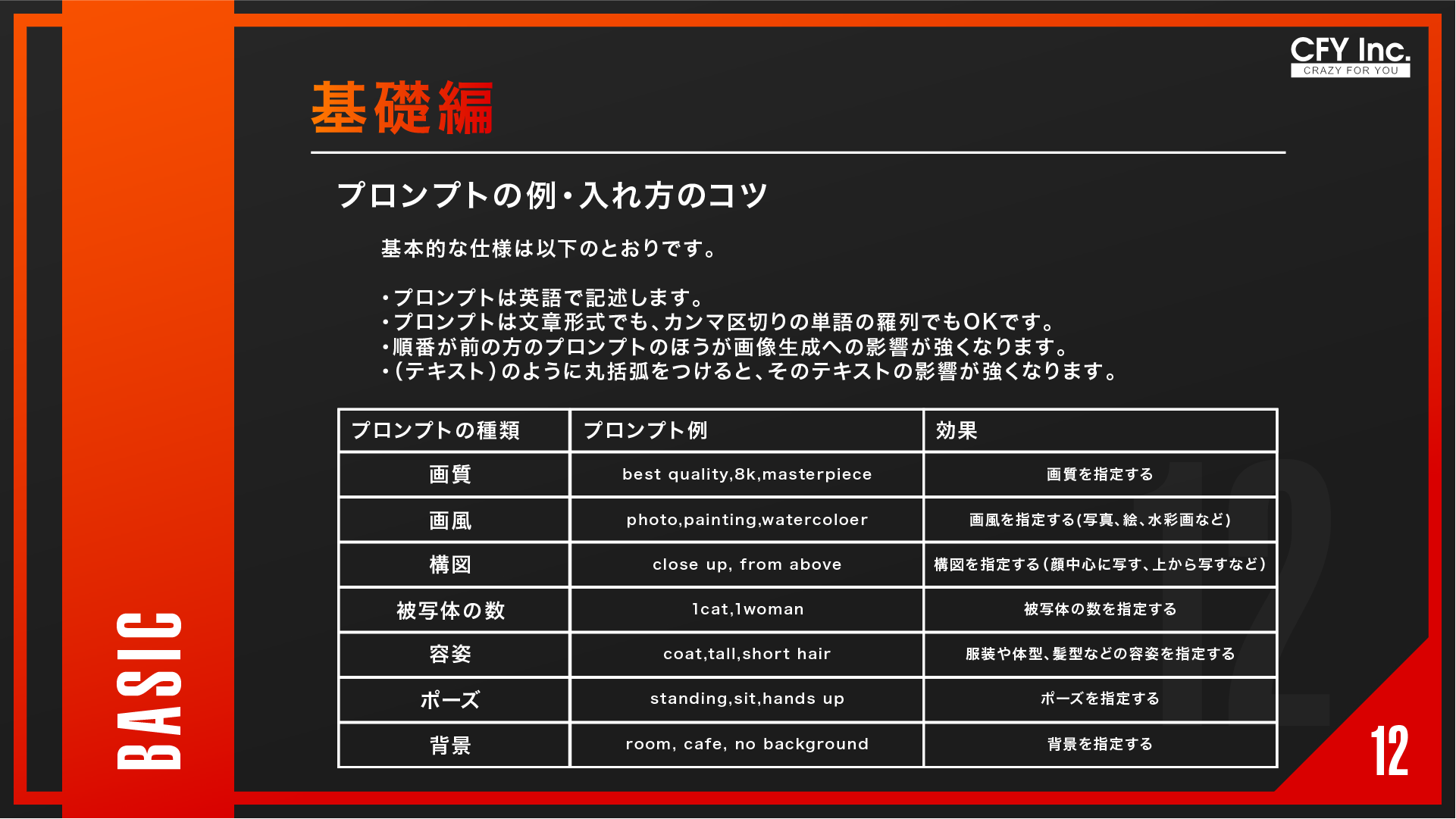 プロンプトには入れ方のコツがあります。まず、プロンプトは英語で記述します。文章形式でも、カンマ区切りの単語の羅列でもOKです。順番が前のプロンプトの方が画像生成への影響が強くなります。(テキスト)のように丸括弧をつけると、そのテキストの影響が強くなります。