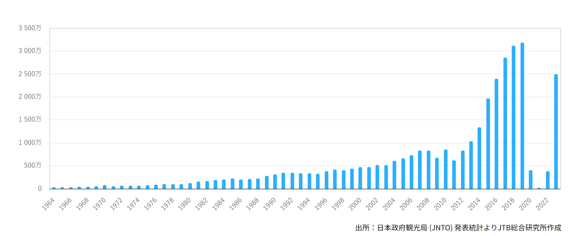 訪日外国人旅行者数(インバウンド)は、19年に3188万人と過去最高を記録しましたが、コロナ禍を受けて20年412万人、21年25万人、22年383万人に減少しました。その後、水際措置が22年10月に大幅緩和、そして23年4月に撤廃されると、国際線の復便・増便が進み、急速に回復しています。