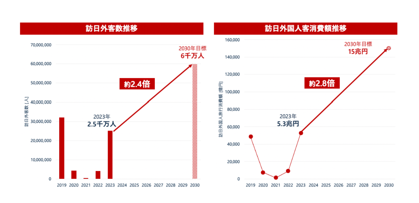 24年1~3月のインバウンドはコロナ前の19年1~3月比6.3%増の856万人と滑り出し好調で、24年通年でも過去最高の3188万人(19年)を更新する可能性が高いと予想されています。さらに25年には、4200万人にまで拡大し、消費額も8.5兆円に伸びると予想されています。岸田首相は、24年1月30日の施政方針演説にて、30年の訪日外国人旅行者数6000万人、消費額15兆円の達成を目指すとの考えを示しました。