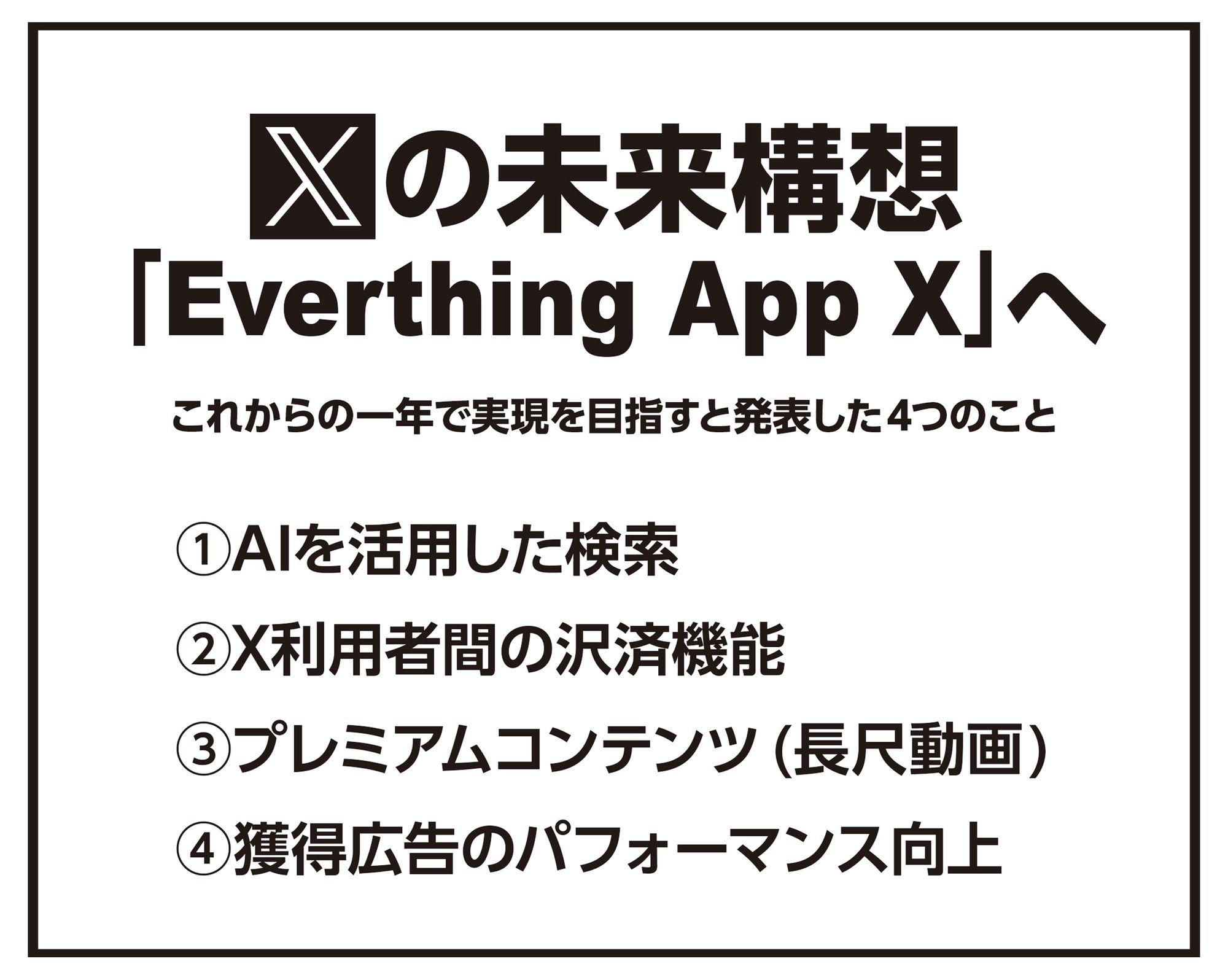 まず大まかに、今後のXはどうなるのか?というと「Everything App」を目指していくということになります。Everything Appとは、スーパーアプリとも呼ばれており、支払いサービスや、インスタント・メッセージング・サービスなどの複数のサービスを提供できるモバイルアプリケーション、又はWebアプリケーションであり、事実上、個人生活および商業生活の多くの側面を包含する、包括的な自己完結型の商取引および通信オンラインプラットフォームのことをいいます。私たちの身近なEverything Appとしては「LINE」が有名ですが、X社の最高経営責任者(CEO)イーロン・マスク氏はTwitter社を買収した当初からTwitter(現、X)をEverything Appにすると発表していました。今回、松山歩 氏のセミナーでは、Everything Appを目指すための新サービスが示されましたので、その内容を解説したいと思います。発表された新サービスは主に4つです。