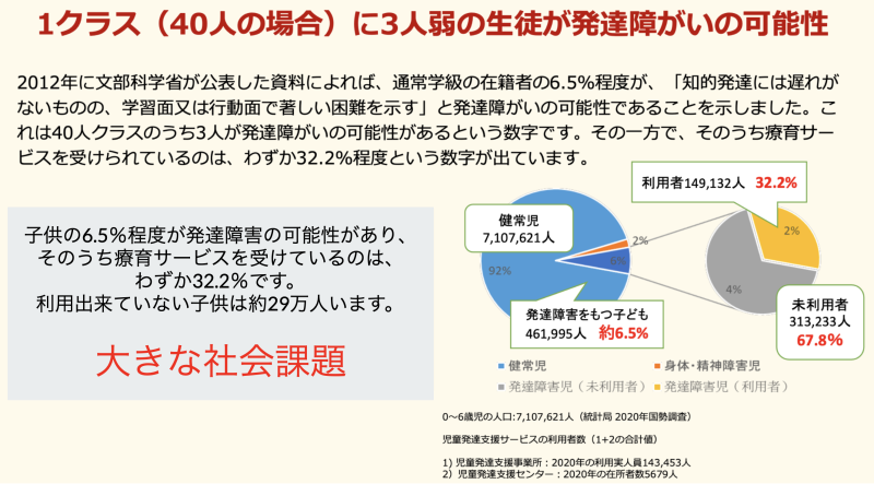 療育施設は、障害を持つ子供の数に比べてまだまだ足りない状況が続いています。私の第2子も発達障害で就学前に療育施設に通っていましたが、とにかく予約が取りにくく、苦労した経験があります。私たちの事業展開は、療育施設の不足状況を少しでも改善したいという想いがあります。