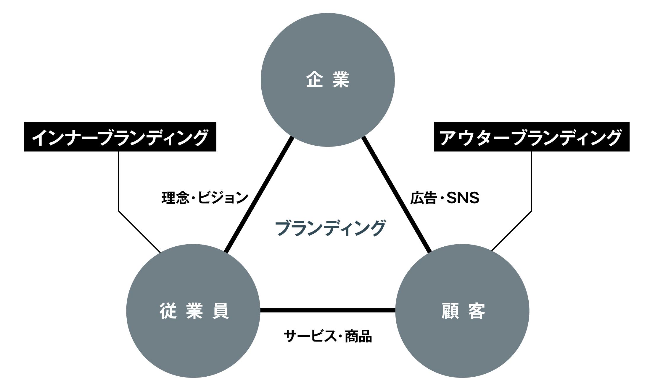 この図は、ブランドが「企業」「従業員」「顧客」の三者によって構成されており、それぞれがブランドの信頼性と価値を支える重要な役割を担っていることを示しています。左側の「インナーブランディング」は、企業から従業員に向けて理念やビジョンを伝える活動です。ここで育まれた価値観や目的意識が、従業員一人ひとりの行動に影響を与え、ブランドの「在り方」として表に現れます。右側の「アウターブランディング」は、企業がその“在り方”を社会や顧客に伝えていく活動。広告やSNS、PRなどの手段を通じて、企業の想いや姿勢を可視化し、顧客との信頼関係を築いていきます。そして、それらの接点として「サービス・商品」が存在します。これは、従業員の実践によって生まれ、顧客との接点となる“ブランド体験”そのものです。つまり、ブランドは企業から一方的に作り上げるものではなく、内外の関係性の中で育ち、信頼として循環するものです。このように、ブランドは「見せ方」でなく「在り方」から始まります。そしてその“在り方”が社内に浸透し、社外に伝わることで、企業としての一貫性と信頼が確立されていきます。