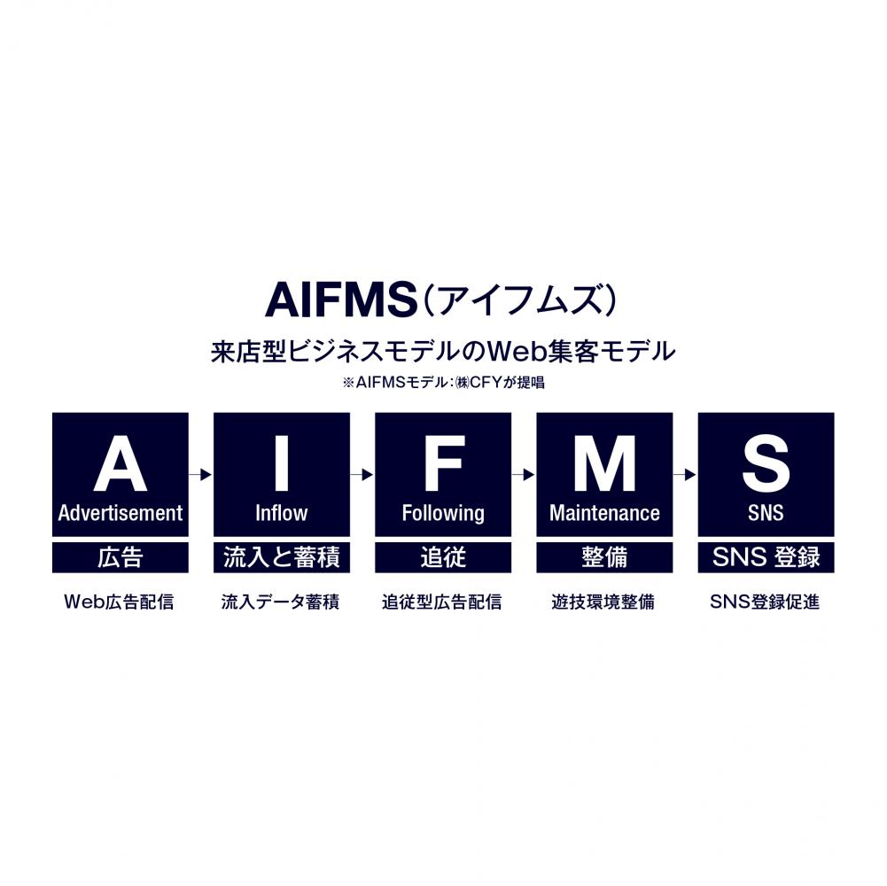 AIFMSは、企業がWeb集客を実施する場合に「有効的な集客施策」を講じるための5ステップをモデル化したものであり、「来店型ビジネスモデル企業向けのWeb集客モデル」として提唱しています。
